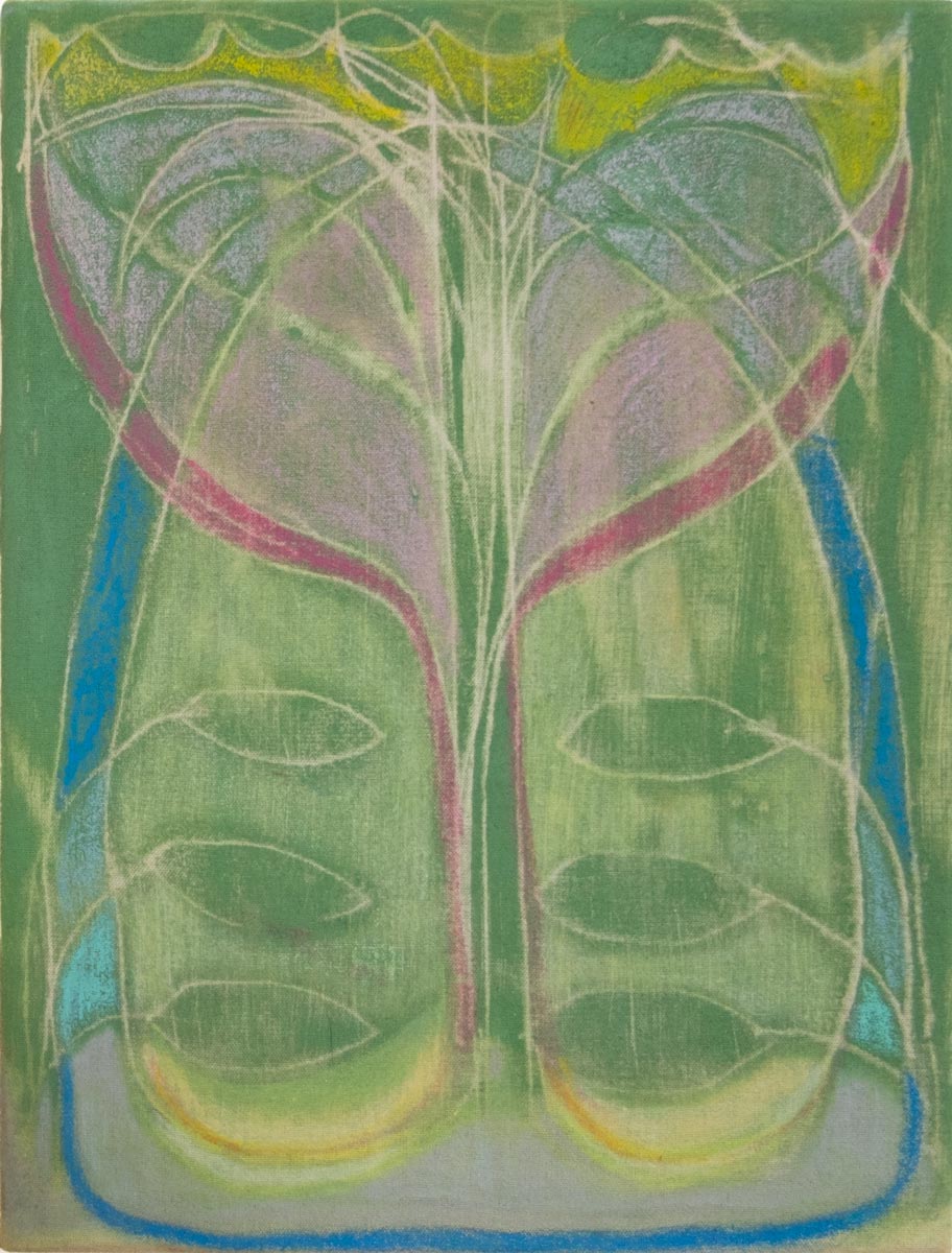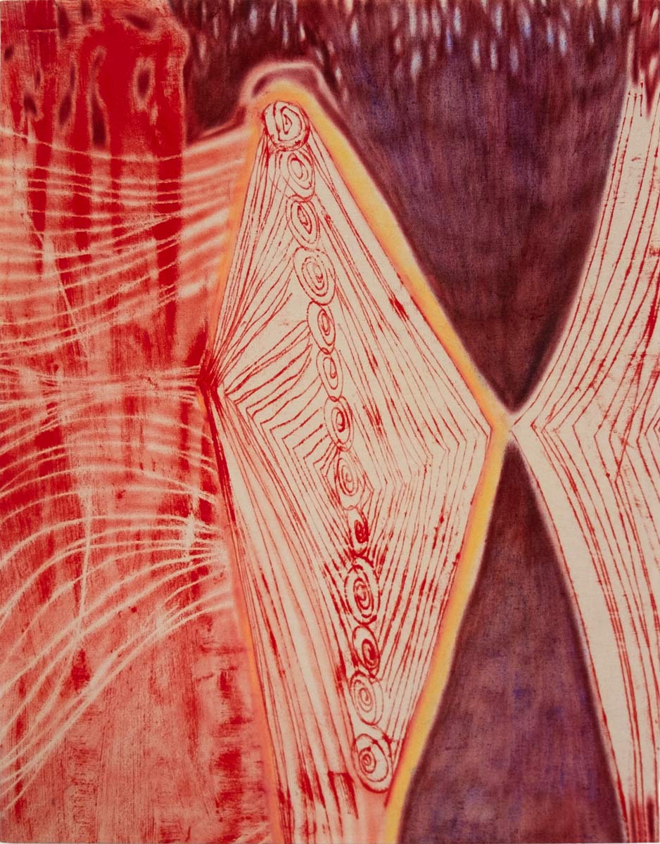 deutsch: Ich arbeite mit dem Druckverfahren der Monotypie, das ich auf Baumwollstoff anwende. Was mich an der Monotypie besonders interessiert, ist das Ungewisse und der Zufall, der zwischen meiner Bildidee und der Technik entsteht. Das Umdenken, dass ich spiegelverkehrt zeichnen muss, und die Tatsache, dass ich nicht sofort sehe, was abgedruckt wird, erzeugen einen starken Überraschungsmoment. Für mich lebt diese Technik von der Direktheit und Schnelligkeit der Arbeit, da sie keine Retuschen zulässt. Sie ist eine sehr unmittelbare Art der Zeichnung auf Stoff. Thematisch setze ich mich mit dem Frau-Sein, Weiblichkeit, dem Zyklus des Lebens, Schwingungen und Energie, Rhythmus sowie den Verbindungen zwischen Natur, Mensch und Emotionen auseinander. Mein Ziel ist es, stimmungsvolle Bilder zu schaffen, die Emotionen transportieren und den Betrachter mit seinen eigenen Gefühlen in Verbindung bringen.