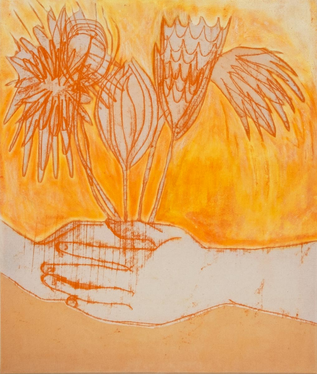 I work with the printmaking technique of monotype, which I apply to cotton fabric. What fascinates me most about monotype is the element of uncertainty and chance that arises between my creative idea and the process itself. The need to draw in reverse and not being able to see the print immediately create a strong sense of surprise. For me, this technique thrives on the immediacy and speed of the work, as it doesn’t allow for corrections. It is a direct way of drawing on fabric.